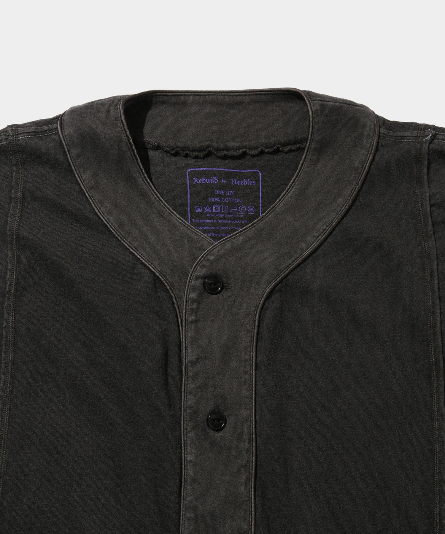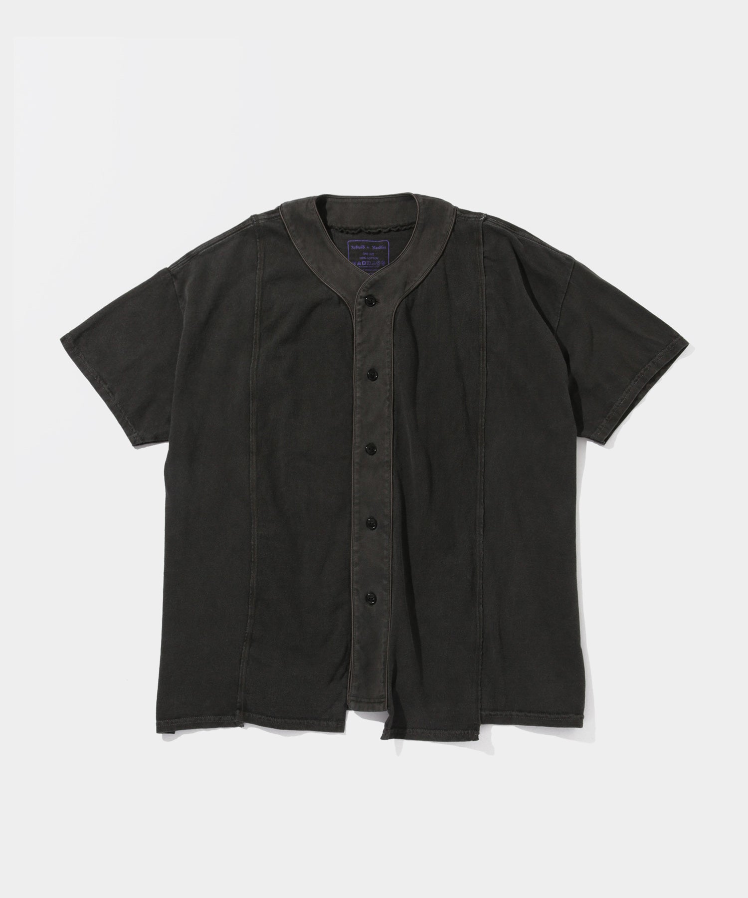 オーバーダイ加工を施したベースボールシャツ。無地ボディのTシャツを縦にカットし、ベースボールシャツ仕様に再構築しています。パーツとなるTシャツの着丈がそのまま活かされているため、1点1点裾の長さが異なります。